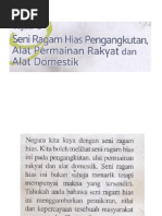 Seni ragam hias pengangkutan beca & kereta lembu • di negara kita, pengangkutan yang sering dikaitkan dengan seni ragam hias ialah pengangkutan tradisional seperti beca, kereta lembu dan perahu. Fungsi seni ragam hias ini adalah untuk memaparkan nilai estetik dan menarik perhatian. Mengikat tali kemudi alat permainan rakyat alat domestik • kebiasaannya khas untuk suatu unit budaya pada masa tertentu. Beca kereta lembu menyangkut galah panjang & pukat.